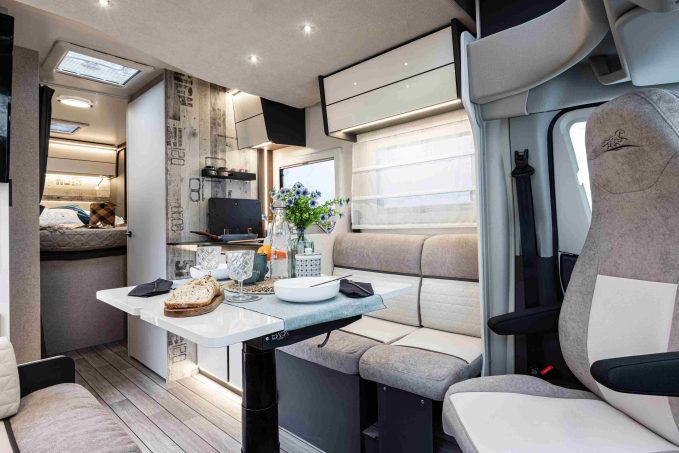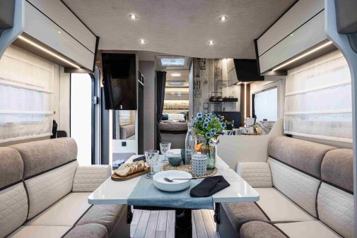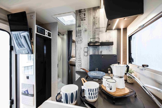 À l’intérieur, on retrouve une dînette face face perpendiculaire à la route, chapeautée par un lit de pavillon, avec au centre, la table modulable. Dans le bloc cuisine, logent un évier, un réchaud deux feux et de nombreux rangements. En face, un réfrigérateur de 137 litres est installé.