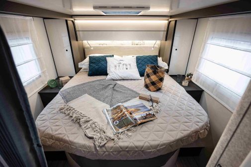 Enfin, la chambre est confortable, et ce, quel que soit le modèle (Yearling 70 ou 81). Pour le Yearling 70, une penderie est située sous le couchage de gauche et pour le Yearling 81, les penderies sont de part et d’autre de la tête de lit. Sur le Yearling 70, les lits jumeaux peuvent se transformer en grand lit king size de 190 cm de large. Yearling 70 et 81 sont commercialisées 68 490 €.