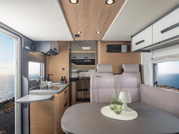 Oubliez la monotonie du blanc traditionnel. Pour cette édition spéciale Black Selection, Knaus joue la carte de l'élégance radicale. Le profilé L!ve Wave 650 MEG arbore un contraste saisissant entre sa cabine d'un noir profond et sa cellule habillée du célèbre gris Campovolo. Cette teinte moderne est rehaussée par une sérigraphie exclusive qui souligne le caractère dynamique de ce véhicule de moins de 7 mètres.