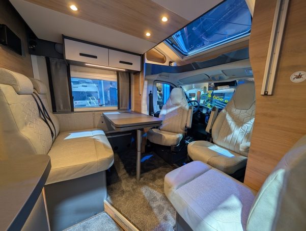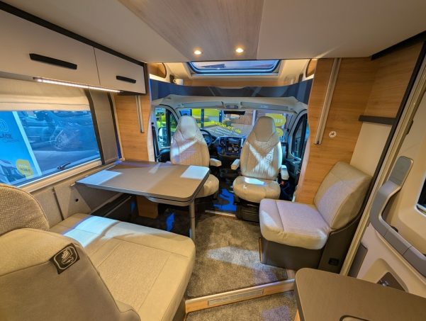 Il surmonte discrètement le salon composé pour sa part d'une banquette face route (intégrant deux ceintures de sécurité), d'un sofa latéral, et des sièges pivotants du porteur Fiat.