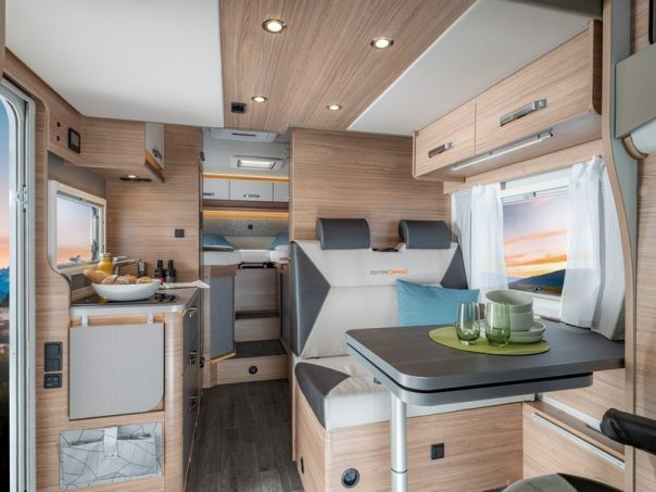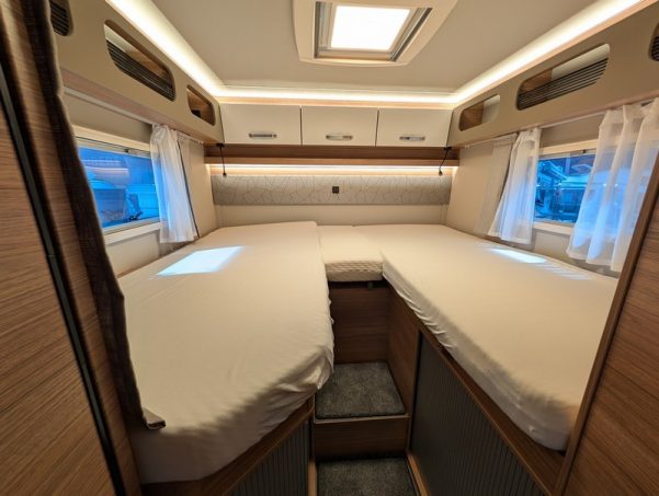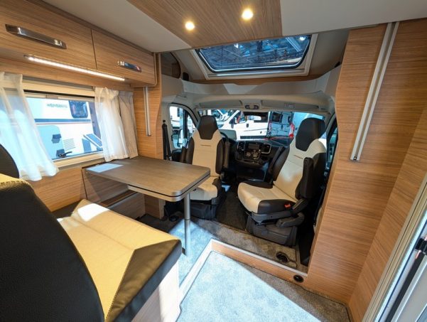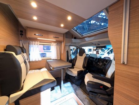 Sur une longueur juste en-dessous des 7 mètres, ce modèle conserve l’implantation qui fait son succès : une chambre arrière dotée de lits jumeaux sur soute, offrant un couchage confortable et un volume de rangement généreux. En partie avant, ce CaraSuite profite d'un salon conventionnel avec banquette face route (homologuée route pour deux personnes) associée aux sièges pivotants du porteur. Mais ce dont dispose ce profilé, c'est aussi d'un lit de pavillon manuel monté d'origine sur ce modèle. Il augmente ainsi la capacité d'accueil nocturne.