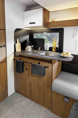Ce nouveau fourgon s’axe sur la simplicité d’usage pour séduire les primoaccédants. Il se base ainsi sur une implantation très convoitée de la marque avec ses lits double superposés arrières. Et cette Sweet Line se démarque avec plusieurs petites astuces disséminées dans l’habitacle. Parmi elles, on retrouve une enceinte Bluetooth fixe et un chargeur à induction au-dessus du bloc cuisine. Des supports à épices aimantés, une table dépliante style « SNCF », des éclairages retravaillés et une tablette extérieure viennent compléter le tout.