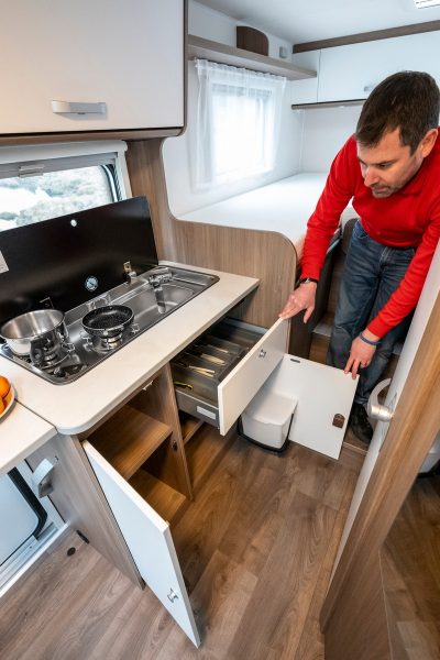 La cuisine en L propose un bloc de 90 cm intégrant réchaud deux feux et évier inox, complété par une extension escamotable. Face au meuble, un grand réfrigérateur de 137 l - le seul dans cette gamme V – optimise l’autonomie. La salle d’eau adopte une solution Vario avec paroi pivotante : en un geste, l’espace toilette se transforme en douche indépendante, garantissant une bonne isolation de l’eau.