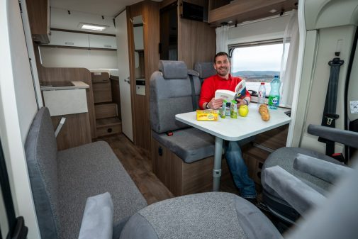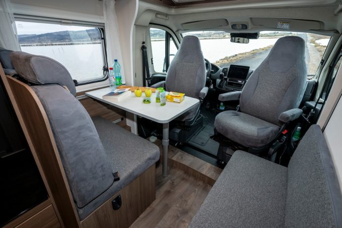 À l’avant, le V347 soigne l’accueil. Les sièges cabine pivotants s’intègrent à une dînette face route complétée par un sofa latéral. Résultat : jusqu’à cinq convives peuvent prendre place à l’étape. La circulation reste fluide et la sensation d’espace est renforcée par la belle hauteur intérieure (1,98 m). En option, un skyview dans la casquette apporte un surcroît de lumière naturelle très appréciable. L’ambiance est sobre, fonctionnelle, fidèle à l’ADN Carado.