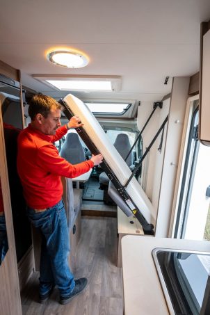 La grande innovation de ce modèle se niche au-dessus du salon. Baptisé Clever Lift, le lit escamotable mural est dissimulé dans l’épaisseur de la paroi. Une fois déverrouillé, le sommier bascule et vient se positionner au-dessus de la dînette, dévoilant un couchage de 80 x 185 cm, homologué jusqu’à 120 kg. Facturé seulement 805 € en option, ce dispositif permet d’augmenter la capacité nocturne sans condamner la hauteur sous plafond lorsque replié. Discret, simple à manipuler et parfaitement intégré, il constitue un atout évident.