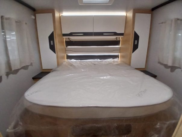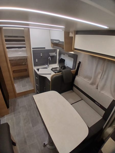 À bord, l’ambiance évolue avec une nouvelle sellerie Mercure valorisant un salon face-à-face, très prisé sur le marché français. Un lit de pavillon électrique complète l’offre de couchages, tandis que la chambre arrière accueille un lit central de 141 x 192 cm, accessible de chaque côté.
