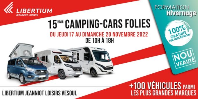 La 15ème édition des Camping-cars Folies aura lieu chez Libertium Jeanniot Loisirs Vesoul, du jeudi 17 au dimanche 20 novembre 2022, de 10h00 à 18h00.