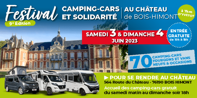 Le Festival Camping-cars et Solidarité au Château revient pour sa 9ème édition le samedi 3 et dimanche 4 juin 2023. Rendez-vous dans le Parc du Château de Bois-Himont (à 7 km d'Yvetot) pour trois jours de festivités, de rencontres et d'échanges !