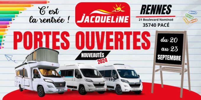 Rendez-vous chez Jacqueline Camping-Car Rennes du mercredi 20 au samedi 23 septembre 2023 pour les Portes Ouvertes spéciales "Rentrée" C'est le moment idéal pour planifier vos prochains voyages en camping-car, van, fourgon ou caravane.