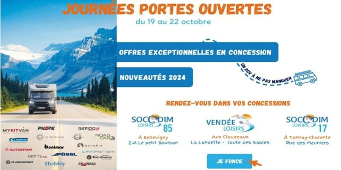 Rendez-vous dans les concessions SOCODIM LOIRSIRS 85, VENDÉE LOISIRS et SOCODIM LOISIRS 17 pour les Journées Portes Ouvertes du 19 au 22 octobre 2023.