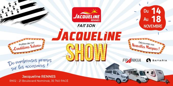 Jacqueline Show chez Jacqueline Camping-car Rennes ! Portes Ouvertes du 14 au 18 novembre 2024, Jacqueline Camping-car Rennes vous réserve une semaine d'animation commerciale exceptionnelle.