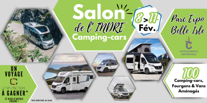 Le Salon du camping-car et du Loisir de l’Indre se déroule du jeudi 08 février au dimanche 11 février 2024 de 10h à 19h non stop au Parc Expo de Belle-Isle à Châteauroux (36).