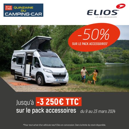 La marque ELIOS organise une belle opération promotionnelle à l’occasion de la « Quinzaine du Camping-car » qui aura lieu du 9 au 23 mars 2024.