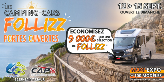 Retrouvez les Portes Ouvertes "Les camping-cars Follizz 36" du 12 au 15 septembre 2024 organisées par les concessions Berry camping-cars et Cap 36.