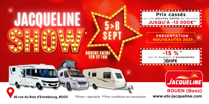 Jacqueline fait son show* ! Venez découvrir un large choix de véhicules neufs et occasions lors des Portes Ouvertes du jeudi 05 au dimanche 08 septembre inclus chez Jacqueline camping-car Rouen.