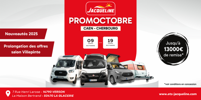 Retrouvez les Promoctobre dans les concessions Jacqueline Camping-car Caen et Cherbourg du 09 au 19 octobre 2024.