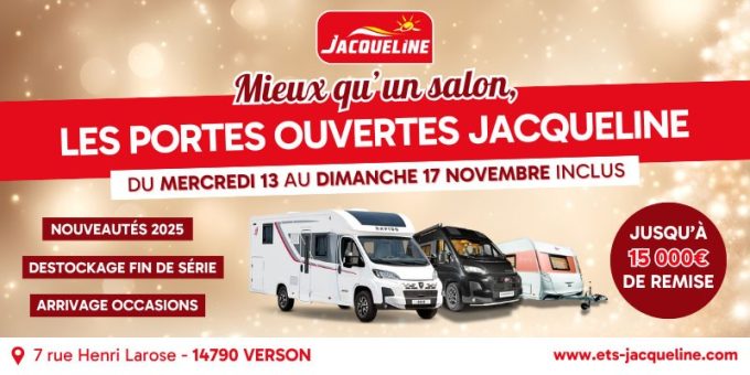 Retrouvez les Portes Ouvertes chez Jacqueline Camping-Car de Verson du mercredi 13 au dimanche 17 novembre 2024.