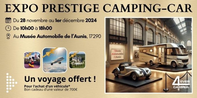 L'évènement se déroulera du jeudi 28 Novembre au dimanche 1er décembre 2024 au Musée de l'automobile à Aigrefeuille d'Aunis/Le Thou 17290. Des Camping-cars haut de gamme seront exposés durant ces 4 jours. Neuf et Occasion.