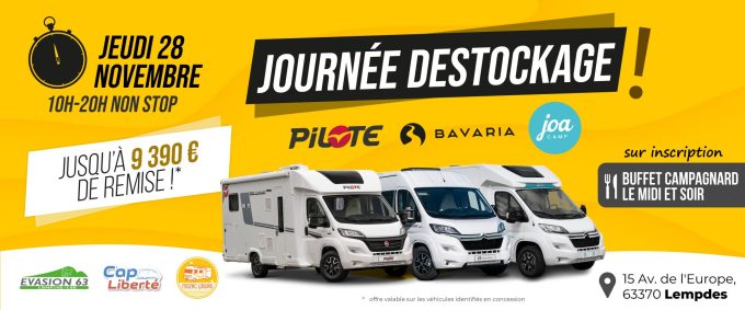 Retrouvez une grande journée de déstockage des marques Pilote Bavaria Joa chez EVASION 63 à Lempdes le Jeudi 28 Novembre 2024 de 10h à 20h NON-STOP !