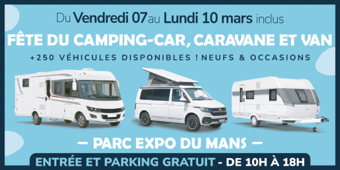 Du vendredi 7 au lundi 10 mars inclus, de 10h à 18h, les concessions Azur 72 et Libertium Ouest, présentes dans la Sarthe, participent à la Fête du camping-car et de la caravane au Parc des Expositions du Mans (1 Avenue des Expositions - 72100 Le Mans).