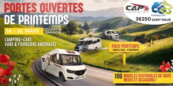 Retrouvez les Portes Ouvertes de printemps chez vos concessionnaires BERRY CAMPING-CAR et CAP 36 du 14 au 16 mars 2025 pour découvrir toute leurs gammes de camping-cars, vans et fourgons aménagés !