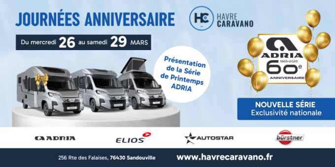 Rendez aux Portes Ouvertes chez Havre Caravano pour les 60 ans d'ADRIA: Découvrez la nouvelle série de printemps du 26 au 29 mars 2025.