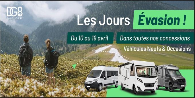 Retrouvez les Jours Evasion chez DG8 Camping-car du 10 au 19 avril 2025.