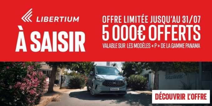Vous rêvez d’évasion, de liberté, ou simplement d’un véhicule capable de suivre le rythme de votre quotidien, ne cherchez plus : jusqu’au 31 juillet 2025, bénéficiez de remise* sur les modèles Panama P sur porteur Ford uniquement dans les concessions Libertium participantes*.
