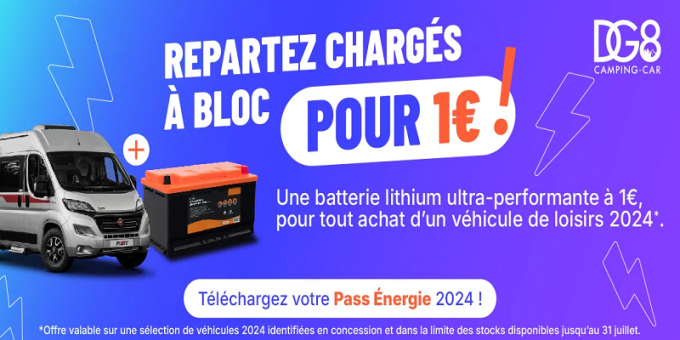Du 08 au 31 juillet 2025, DG8 Camping-Car vous offre une batterie lithium Bluetooth 100Ah pour seulement 1€ (pose comprise) pour tout achat d’un véhicule neuf 2024. Offrez-vous l’autonomie, à prix doux.