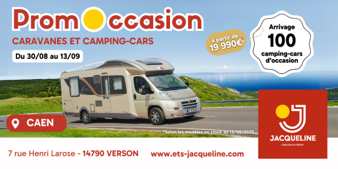 La concession Jacqueline Camping-Car Caen, située à Verson, organise son événement Prom0ccasion du 30 août au 13 septembre 2025.
