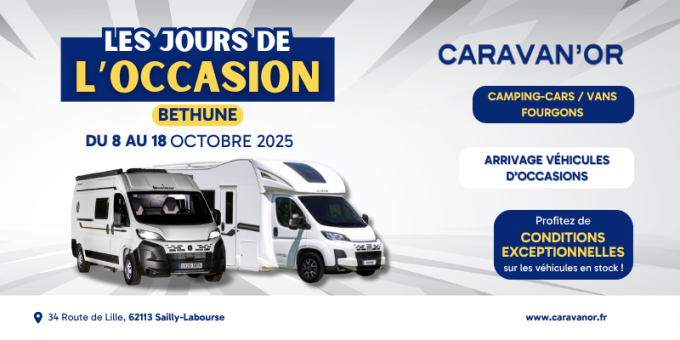 Du 8 au 18 octobre 2025, la concession Caravan’or Béthune organise LES JOURS DE L’OCCASION : un événement incontournable dans la région pour découvrir un large choix de camping-cars, vans et fourgons d’occasion.