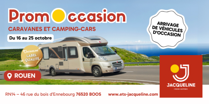 Venez découvrir chez Jacqueline Camping-Car Rouen du 16 au 25 octobre leur opération spéciale Promoccasions, dédiée aux caravanes et camping-cars d’occasion.