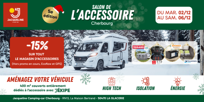 Jacqueline Camping-Car Cherbourg vous donne rendez-vous du mardi 2 au samedi 6 décembre 2025 pour la 5ᵉ édition du Salon de l’Accessoire, un événement devenu incontournable pour tous les passionnés de camping-car, caravane, fourgon et van aménagé