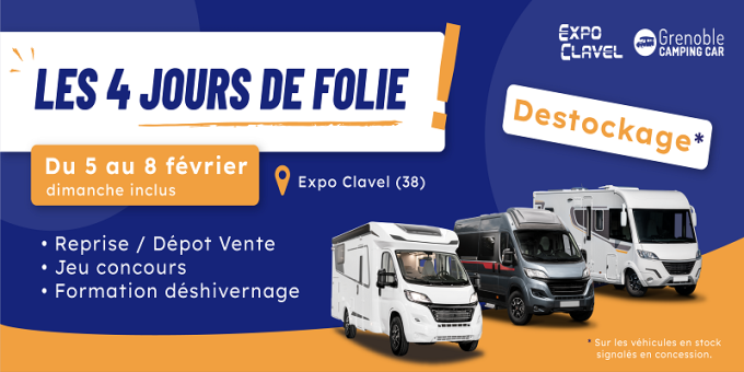 Retrouvez du 5 au 8 février 2026 dans les concessions Expo Clavel et Grenoble Camping-Car du Groupe DG8 un événement exceptionnel dédié au véhicule de loisirs.