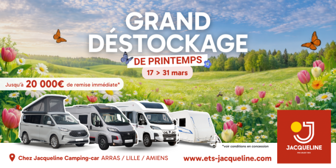 Rendez-vous pour le Grand Déstockage de Printemps chez Jacqueline Camping-Car du 17 au 31 mars 2026.