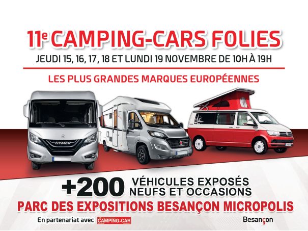 De 10 h à 19 h, le parc des expositions de Besançon Micropolis vous accueille pour le 11e Camping-cars Folies. A cette occasion, plus de 200 véhicules des plus grandes marques européennes seront exposés.