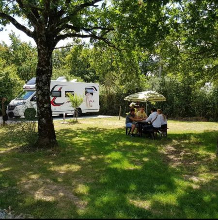 Une aire familiale a taille humaine (5 emplacement). Pas de vidange mais a disposition gratuitement salle commune avec cuisine,douche, WC, boite a livres. On peu faire sa vaisselle en buvant un café ( offert). Grands emplacements avec tables a l ombre de grands Chênes. Remplissage d eau 2 €