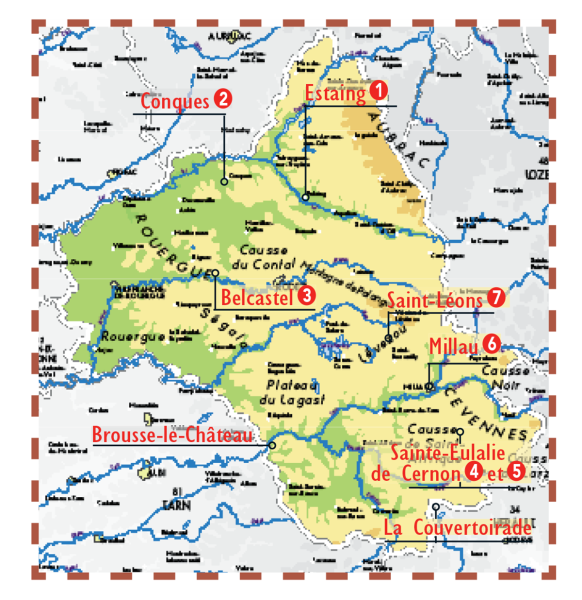 En continuant vers le sud, les villages médiévaux Belcastel et Narjac sont dominés par leur château-fort. Deux beaux villages qui reposent chacun à flanc de colline. Dans la vallée du Tarn, Brousse-le-Château est également un bel exemple de l’architecture médiévale. Peyre est également une étape singulière : ses maisons et son église sont adossées aux falaises au point de sembler s’y fondre complètement. Pourquoi pas aussi pousser jusqu’à Millau pour y voir son célèbre viaduc conçu par l’ingénieur Michel Virlogeux d’après les dessins de Normann Forster. Et en traversant le Larzac, classé au patrimoine mondial de l’Unesco, il ne faut pas manquer de faire étape à La Couvertoire. Un village fondé par les Templiers transmis par la suite aux Hospitaliers et garde encore aujourd’hui ses remparts intacts. Et pour finir ce voyage, pourquoi ne pas faire une halte à La Cavalerie ou encore à Sainte-Eulalie-de-Cernon, deux cités également marquées par la présence des Templiers.