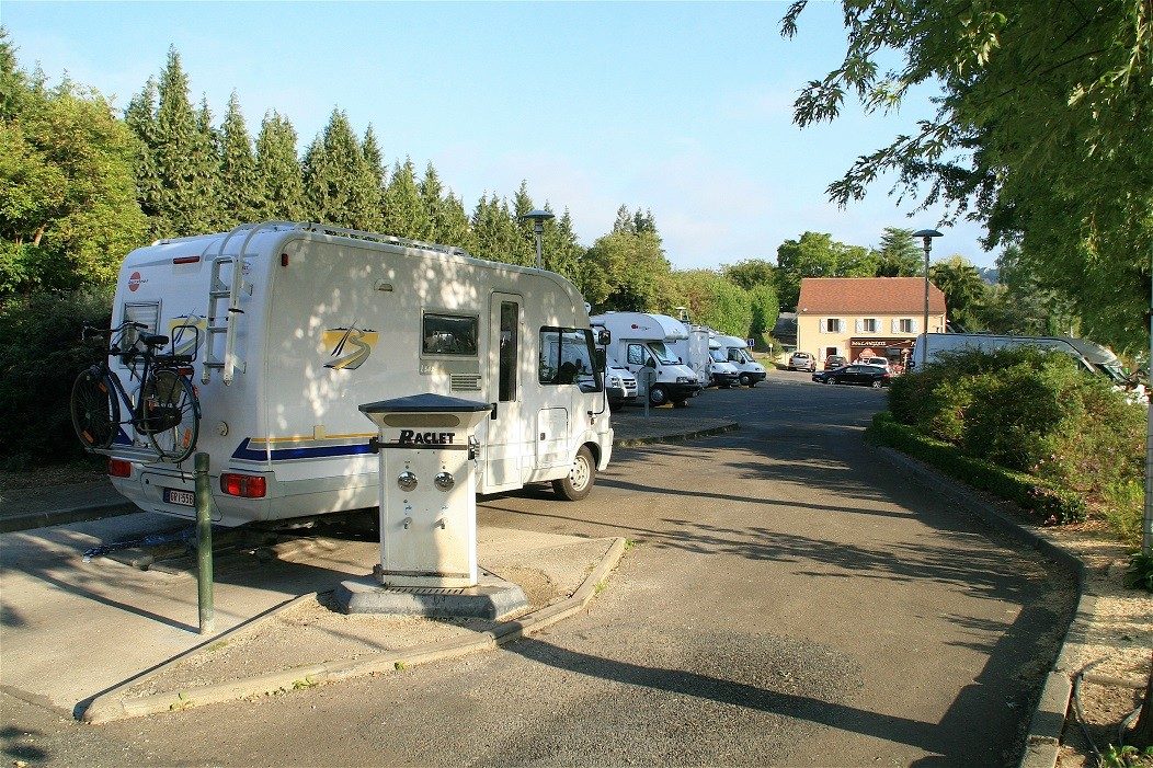 Une aire pour une trentaine de véhicules, avec borne de services, a été aménagée en bord de route, sur sol en déclivité (GPS: (N) 44°53’45”, (E) 01°12’45”). Le centre historique est à une quinzaine de minutes à pied. Nuitée: 7€.