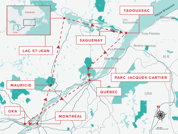 Après une nuit de repos pour vous remettre du décalage horaire, c’est enfin le temps de prendre la route. Prenez votre camping-car et partez vers la Mauricie. Le parc national qui s’y trouve couvre 536 km2 et abrite plus de 150 lacs. Pour cette première journée, parcourez la route panoramique qui traverse le parc, s’échelonnant sur 63 km. Celle-ci est parsemée de plusieurs belvédères ponctués de panoramas à couper le souffle.