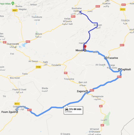 Prendre alors une route très récente (2018) qui vous conduira à Tazzarine en passant par Tarhbalt, toute neuve donc en très bon état avec la possibilité de découvrir encore une nouvelle variété de Paysage.