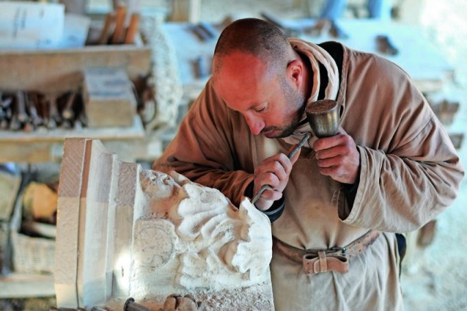 D’autres bâtisseurs ou “œuvriers”, ont des parcours plus atypiques encore. Un chauffeur de poids lourds est également tailleur de pierre. Tous se sont formés sur le tas. Des parcours étonnants pour un site qui l’est tout autant. C’est un lieu vivant que l’on prend plaisir à visiter. D'avril à novembre, Guédelon rassemble une singulière communauté – presque une famille – de carriers, tailleurs de pierre, maçons, bûcherons, charpentiers, forgerons, tuiliers, charretiers, vanniers et cordiers, qui transforment puis valorisent la pierre, le bois et la terre pour livrer les secrets des bâtisseurs du Moyen Age.