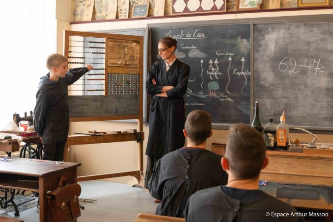 L'Espace Arthur Masson vous propose de vous plonger dans l’atmosphère d’autrefois en revivant une heure de leçon de choses sur la nature enseignée aux élèves du début du XXe siècle. Enfilez votre tablier et découvrez les objets qui ornent la classe : tableau noir, bancs de bois, touches et ardoises, plumes et encriers... Au son de la cloche, laissez-vous porter par l’odeur de l’encre et de la poussière de craie.