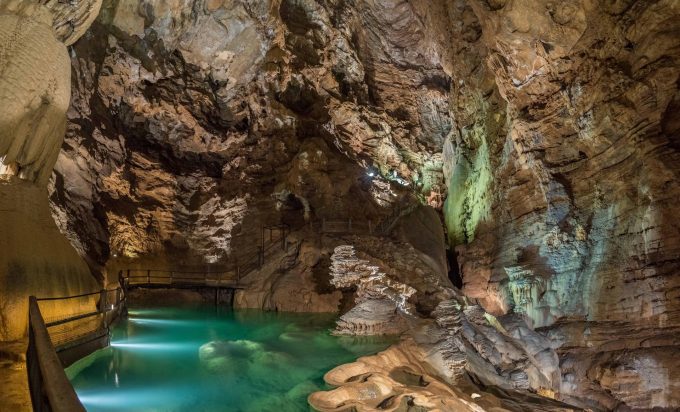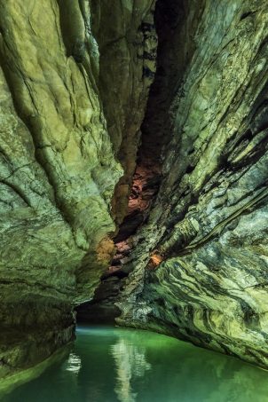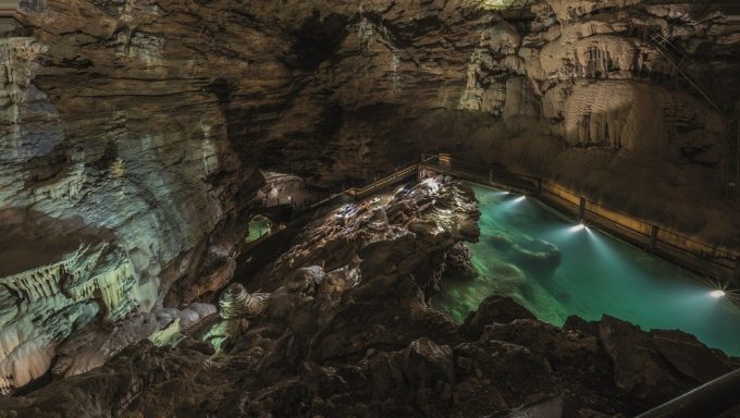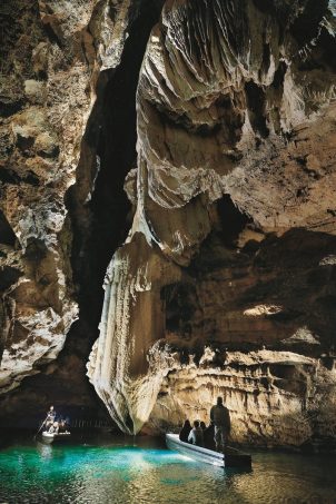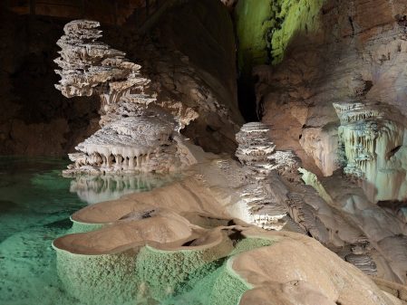 La promenade se poursuit à pied vers les plus belles salles du gouffre. Notamment celle recevant la “Grande Colonne”, une coulée monumentale de calcite d’une hauteur de 75 m. Encore plus majestueuse, la salle du “Grand Dôme” constitue une véritable cathédrale souterraine dont la voute s’élève à plus de 94 m au-dessus de vos têtes. On en oublierait presque l’étrange “pile d’assiettes” – une formation géométrique de stalagmites – qui trône sagement près du “Lac supérieur”. Le chemin du retour passe de nouveau par une balade en barque pour profiter une dernière fois du calme des lieux… surtout lorsque vous avez la chance de faire partie des derniers visiteurs.