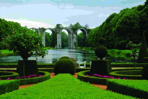 Ces panneaux muraux, dits de Cordoue, datent du XVIIe siècle. Décorés avec des feuilles d’argent, de cuivre ou d’or, ils ont été classés aux “Monuments Historiques” en 1944. On peut en voir dans la salle à manger, là même où le superbe buffet expose de la vaisselle en métal argenté ciselé, frappée des armes de la famille de Noailles. En plus du salon du roi, du passage des boiseries, du grand salon, des bibliothèques ou du salon aux papiers peints chinois (absolument splendides), la galerie des portraits est un autre endroit important du château. Directement inspirée de celles des châteaux de Versailles et d’Eu, elle est entièrement dédiée à l’histoire des familles de Noailles-Mortemart. On y retrouve des tableaux mêlant des portraits authentiques, copiés ou imaginés des grands hommes de la lignée et d’impressionnantes scènes de combats. Au fond de cette galerie, on découvre enfin l’épitaphe de Madame de Maintenon. La magie du lieu ne s’arrête pas là. Dans la cour d’honneur, au pied de l’ancien donjon en grès, des tours en briques rouges et du logis, se dévoilent les jardins à la française. Ils ont été conçus en 1676 par André Le Nôtre, jardinier personnel de Louis XIV, à la période où il travaillait aussi sur l’élaboration des jardins de Versailles. L’aqueduc – que l’on aperçoit de presque partout depuis le château et qui dessine magnifiquement le paysage – devait à l’origine alimenter le fastueux ensemble des jeux d’eau du château de Versailles. Cet ouvrage d’art, dont Vauban avait la charge, avait pour objectif de détourner l’Eure. Le projet a finalement avorté, mais la partie construite du pont, visible à Maintenon, apporte sa touche de romantisme au domaine !