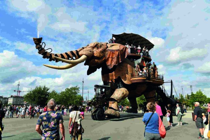 C’est dans ce cadre, après plusieurs années de gestation, entre 2007 et 2012, sous la houlette de François Delarozière et de Pierre Orefice, qu’éclôt l’ambitieux projet artistique et culturel des Machines de l’Ile. Inédit, il s’articule autour de différents espaces et réalisations, où l’imaginaire rejoint souvent celui de Léonard de Vinci, de Jules Verne… Le plus symbolique étant le Grand Eléphant, qui, à heure fixe, transporte jusqu’à 50 passagers dans le parc. Fait de bois et d’acier, il mesure 21 m de longueur, 8 m de large, 12 m de hauteur et pèse plus de 48 tonnes. Il se déplace vers les lieux stratégiques du site, grâce à un savant système de vérins hydrauliques, pneumatiques et à gaz.