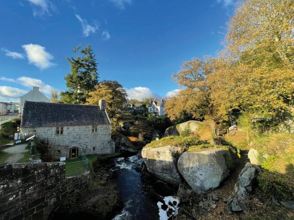 Au beau milieu d’un après-midi automnal, sous le soleil et la brise bretonne, le bruit de la rivière résonne et les feuilles des arbres se manifestent au gré du vent. A l’entrée de la forêt de Huelgoat, une immense carte – peinte sur carreaux – annonce la couleur. Nous sommes bien sur une terre de légendes. Le sentier débute par la vue sur le moulin du Chaos. “Chaos”, mais que signifie ce terme, souvent employé à titre péjoratif ? Ses racines sont ici purement scientifiques : déchaussement des rochers dû à l’érosion. En bref, ces roches granitiques étaient à l’état de masse fondue baignant sous une chaleur d’enfer. Elles se sont ensuite solidifiées par refroidissement à quelques kilomètres de la surface. Ce phénomène a causé des fissures sur les roches, générant le processus d’érosion. Bien sûr, il a fallu plusieurs millions d’années pour qu’elles apparaissent. Aujourd’hui, ces boules granitiques, en équilibre les unes sur les autres, fascinent le visiteur. D’autant qu’elles ont contribué, en plusieurs siècles, à l’écriture des célèbres contes et légendes bretonnes.
