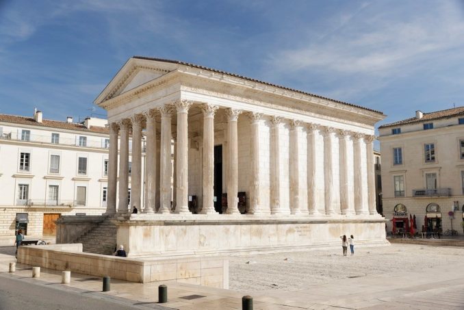 A quelques pas des arènes, se trouve la Maison Carrée. Ce temple romain dédié au culte impérial a été édifié sous le patronage de l’empereur Auguste, en l’honneur de ses petits-fils adoptifs Caius et Lucius Caesar. Ce monument servait de forum. Autrement dit, le cœur économique, politique, administratif et social de la cité. Le terme de Maison Carré sera employé bien plus tard, au XVIe siècle, pour désigner ce temple aux quatre angles droits. Après l’Antiquité, les monuments présentés ont traversé les siècles en résistant aux différents aléas de l’histoire. Dans un souci de transmission, les descendants de la cité nîmoise et du royaume de France ont choisi de maintenir et de préserver les vestiges romains.