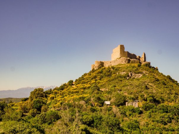 Sous nos yeux, s’alignent des roches, des collines aux formes bien définies, des vignes et de la garrigue qui sentent bon la Méditerranée. En toile de fond, se dressent les sommets pyrénéens, plus imposants. Et juste devant nous, les ruines d’un des fameux châteaux cathares qui semblent toujours veiller sur le pays, telles des sentinelles de pierres surgies d’un autre temps. Il s’agit ici du château d’Aguilar, construit entre les Xe et XIIe siècles. Il a été propriété du seigneur Olivier de Termes, protecteur des Cathares – ces “hérétiques” porteurs d’un schisme chrétien, plusieurs siècles avant celui des protestants, et qui seront anéantis par le roi de France –, avant de devenir une forteresse royale après 1246.
