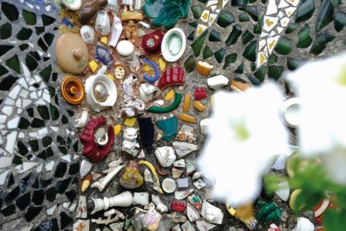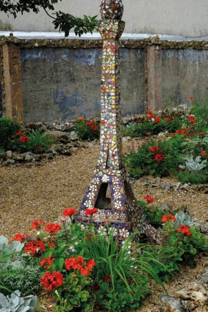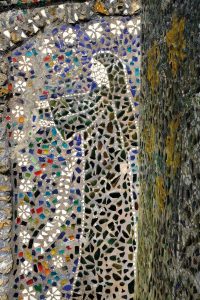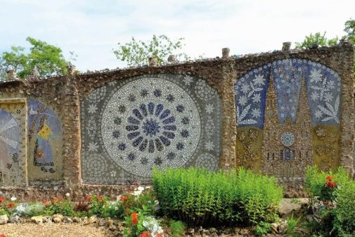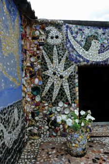 Vous entrez dans un endroit unique, étonnant et détonnant. Vous voici face à une œuvre d’art. Les murs extérieurs, les pièces intérieures, les petits habillements du jardin : tout a été confectionné grâce à des bouts de verre, de porcelaine ou d’assiette dans le but de former des mosaïques absolument fabuleuses. Le résultat est saisissant.